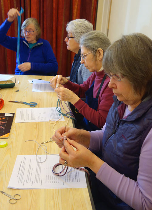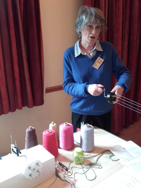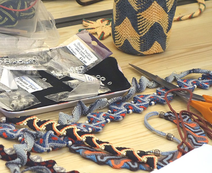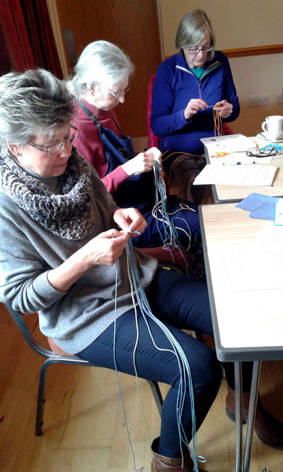 Carole Dickens, an active member of Eden Valley Guild of Spinners, Weavers & Dyers, learnt her skill in ply-split braiding from fellow Guild member Rachel Dufton, about 10 years ago. After admiring the beautiful necklaces, bracelets and key fobs that Carole was producing, other members of EVGSWD asked her to teach them the skill too.
