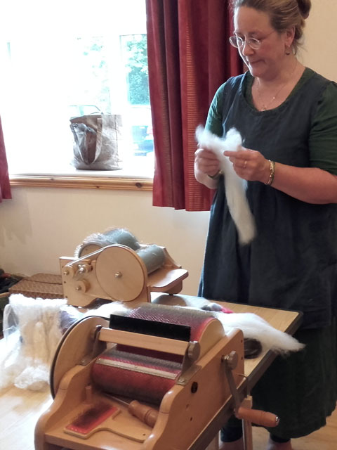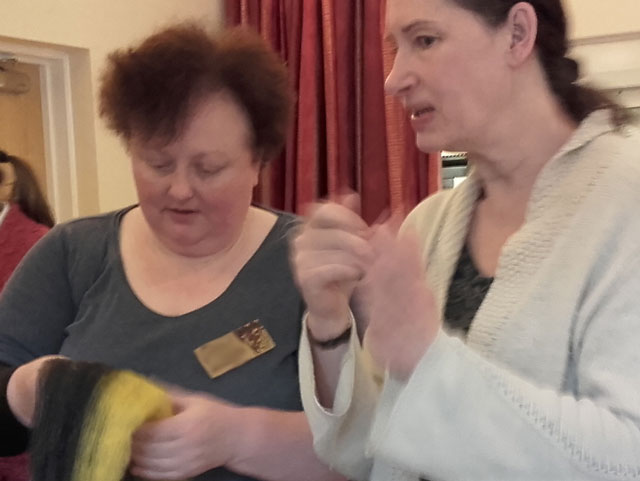 Visiting tutor Freyalyn Close-Hainsworth travelled from West Yorkshire to demonstrate another of her many fibre skills – this time blending wool and other fibres on a drum-carder to produce colourful, airy batts ready for spinning. Eleven Guild members participated, including three members from Tynedale Guild.
