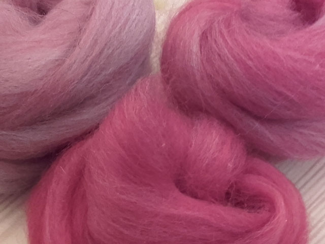 To produce various shades of pink, Freyalyn placed pieces of red fibre on the large drum, doffed it then passed it through the feeder and doffed again. She did the same with some pale blue Merino. The two batts were now of the same weight and density. She then split each bat into eight and combined the two colours in various ratios e.g. ¾ red to ¼ blue. The pieces were passed through the feeder, doffed, split and re-fed. By combining different ratios of blue and red, Freyalyn showed how various shades of redness could easily be produced.