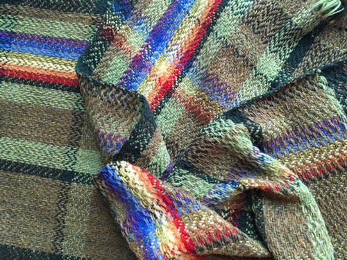 Scarf woven in Knoll Supersoft Shetland. Straight entry threading with zig zag design in lift pattern. Inspired by rainbows against the fells.