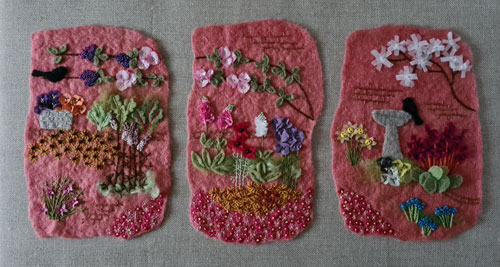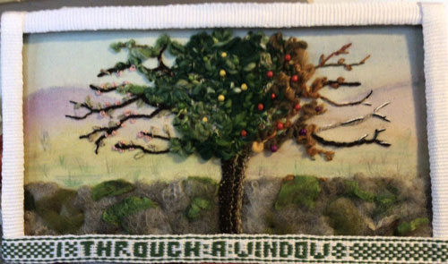 I tried to portray a tree through the year, with flowers to fruit to snowy twigs. Lots of inkle braids, and a fair bit of twisted woolly stuff, but all from my huge stash. The mossy wall was soft felted, and it is all stitched to a hand painted piece of calico. The title could have been better done, but I was too near the deadline, as ever.