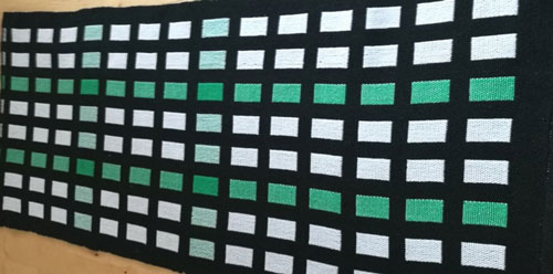 I do see trees from my window so I started to play with tree patterns. These are samples on a cotton warp using silk, cotton and a textured cotton as wefts. I did make a bag with this design, but sent it off as a Christmas present, forgetting to take a photo. I will use the design for something – I can add more trees or have a single one.