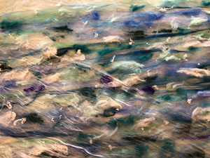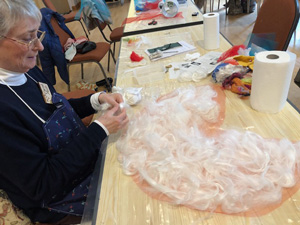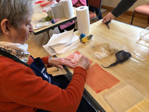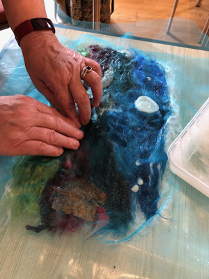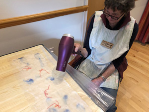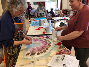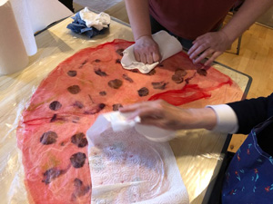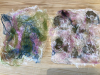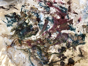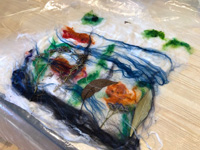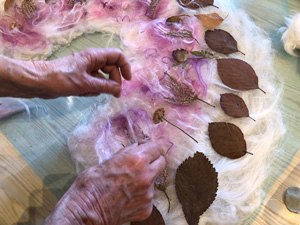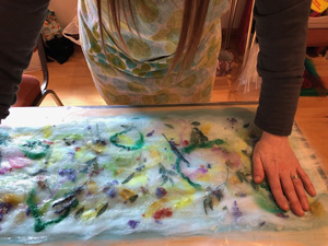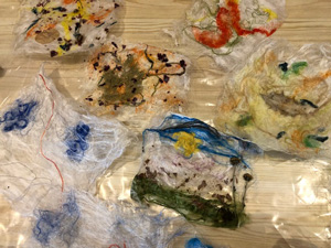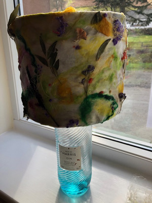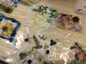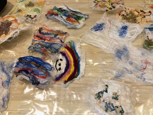 This month workshop participants had the great pleasure of playing with silk, interesting plant fibres, flowers, leaves, coloured silks and yarns to create lampshades or beautiful art pieces with wallpaper paste. Simple and fun but so very effective.