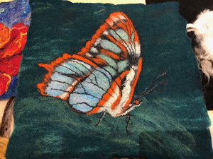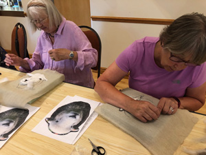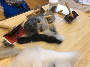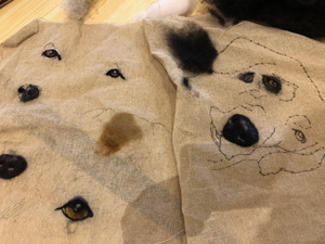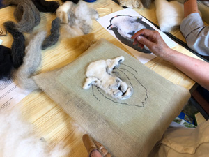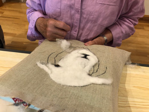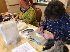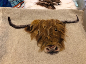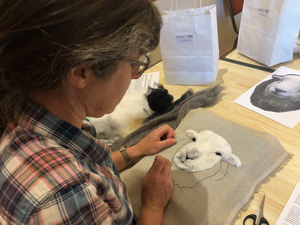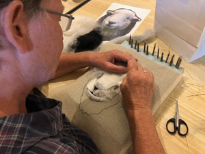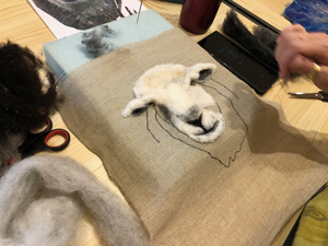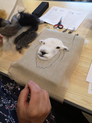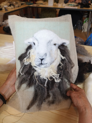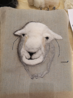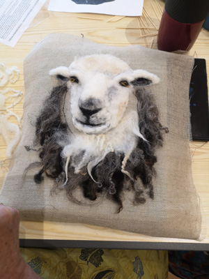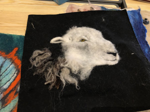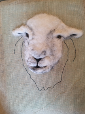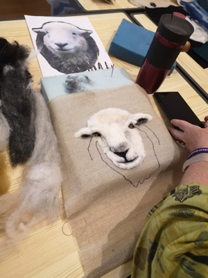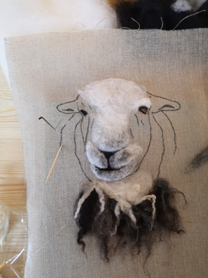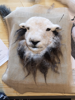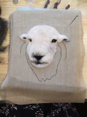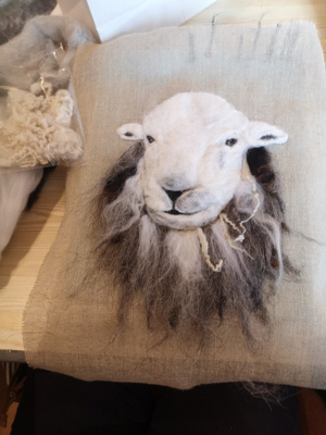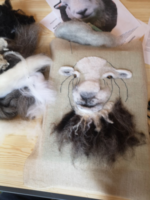 The wonderfully talented Jane came along on Saturday 17th June 2023 to show Guild workshopppers how to create a fantastic Herdwick Sheep picture. Helpfully everyone had an outline taken from a beautiful photo of the Herdy predrawn onto hessian and from the photo each Guild member worked with various fibres and techniques to reproduce the colouring, shading and texture.