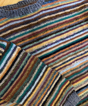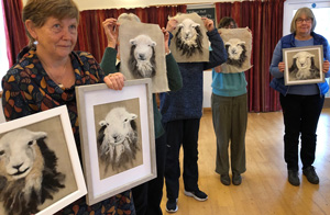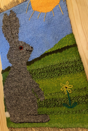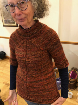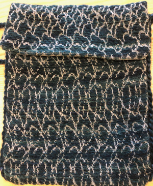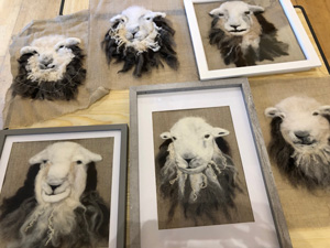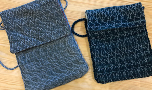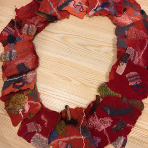 Yet again our busy members wow the gathering with their stunning work from the past year. We were amazed with dyeing using copper piping from Sally, an incredible woven housecoat using the bark of a eucalyptus tree as inspiration from Carol, clever and wavy woven scarves from Hazel, a most useful circular knitting needle holder using double weaving from Shelagh and even some charming woven crisp packet Christmas cards from Ruth. We were delighted by some gorgeous experimental felting, several wonderful knitted woollies and wrist warmers, lots of gorgeous bags we all wanted to take home as well as some fun and interesting tapestry weaving. We also enjoyed seeing the results of the felted sheep portraits workshop and a mindblowing crocheted cardy in progress.