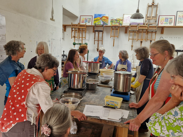 Thirteen guild members had a wonderful day at Higham Hall on Sunday 28th July 2024. We prepared dyebaths of madder, weld, onion skins and indigo and used them to dye woollen yarn vibrant shades of red, yellow, brown, blue and green. The weather was perfect, allowing us to eat our picnic lunches outside. A big thank you to all who took part and helped to make it such a memorable day.