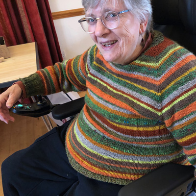 Hazel proudly showing off her wonderful hand spun striped jumper knitted in one piece in the round. Does anyone enjoy sewing seams?