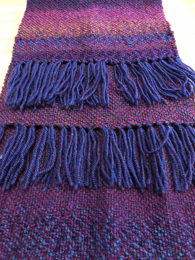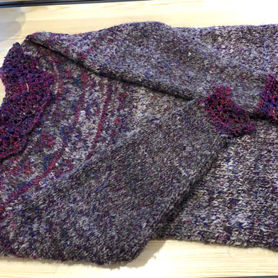 .This soft and charming woven scarf by Anne has never seen a sheep but of course if made a present of some yarn we never look a gift horse in the mouth and Anne certainly succeeded in making something very desirable. We can spend a long time working on a project and just not be happy with the result for whatever reason. I wonder what will ultimately happen to Anne’s jumper. Meanwhile her ‘playing’ on the knitters loom brought a big smile to everyone’s faces with a most joyful and colourful weave.