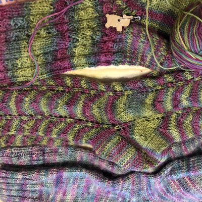 Beautiful variegated BFL yarn plus skilled workmanship equals scrummy welly socks for some happy feet. Jane, long used to knitting underarm, found working with short pins quite a challenge.