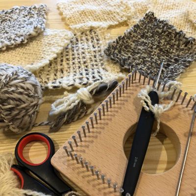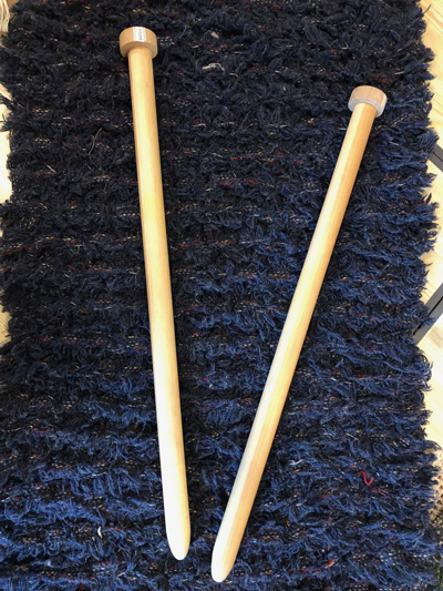 Debbie had planned a semi-circle rug on her pegloom and things didn’t go absolutely to plan, however some lucky spaniel might yet enjoy curling up on it! The next rug however was a roaring success made from Harris Tweed selvedge edges with knitting needles created from broom handles and gin bottle tops. What’s not to love!