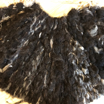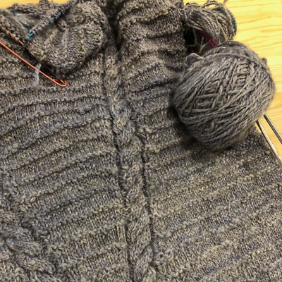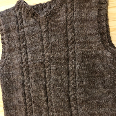 With some unlabelled grey and brown fluff Chris found in the bottom of a box, enough yarn was blended and spun to make this little (but surprisingly stretchy) cabled tanktop.