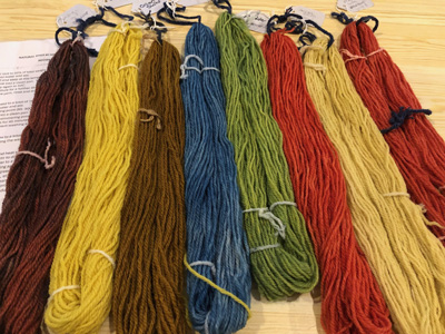 Earlier this year some of our guild members were treated to a weekend of natural dyeing at Higham Hall. This is the result of Carrie’s time there and the skeins, dyed with onion, madder and indigo, are without doubt works of art in their own right.