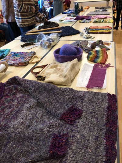 We often see hats at Show and tell but less often 2 very different and impressive hats from a single member. Jan created a pretty crocheted bag made from hand spun Shetland fleece, dyed with onion. She also designed and knitted the diamond pattern beanie, the other was knitted, felted and shaped ready for visits into town away from the farm.